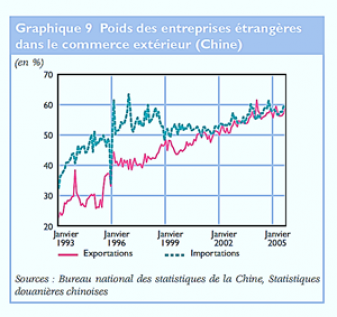 Néanmoins, et surtout dans ce domaine, l’économie chinoise reste encore davantage dépendante des capitaux étrangers. C’est une tendance qui s’est affirmée dès le début du décollage économique, pour finalement se stabiliser, jusqu’à aujourd’hui, et depuis le milieu des années 2000, autour de 60%, ce qui reste très significatif en termes de dépendance.