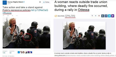 En illustration de ce que nous avancions dans le précédent article « Qui nous défendra » sur le dévoiement des droits de l’homme pour mieux instituer un deux poids deux mesures entre êtres humains et appréciation des crimes contre l’humanité, voici encore une autre démonstration. Elle témoigne de la façon dont certaines organisations officiellement de défense des droits de l’homme sont en fait à la solde de l’impérialisme américain. Dans la première image un appel pour protester contre la politique répressive de m. Poutine est accompagné d’une image représentant une femme désespérée près d’un cordon de policiers. La combinaison de l’image au message contre Poutine suggère que la photographie représentent une contrainte de la police de la Fédération de Russie. En fait, l’image a été prise à Odessa, à l’extérieur du Palais des syndicats, brûlé par les Nazis à Kiev, et la police représentée dans le tableau est de la police d’Ukraine.