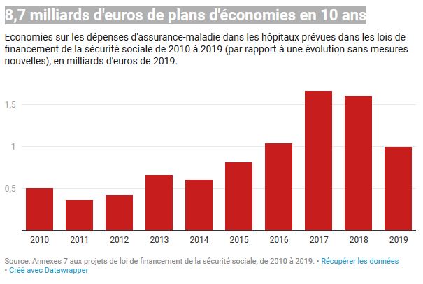 Une longue saignée avant la crise. Les plans d’économies se sont succédé ces dernières années dans les hôpitaux publics et privés, afin de répondre aux objectifs de dépenses fixés par le gouvernement d’année en année. Au total, les établissements de santé ont subi près de 12 milliards d’euros de coupes budgétaires en dix ans. Cette cure d’austérité s’est fortement intensifiée sous le quinquennat de François Hollande, et s’est maintenue à un niveau élevé depuis l’arrivée au pouvoir d’Emmanuel Macron. Autant de moyens qui manquent aujourd’hui pour faire face à l’épidémie de coronavirus, alors que les soignants sont confrontés depuis des années à un manque de lits et de personnels.