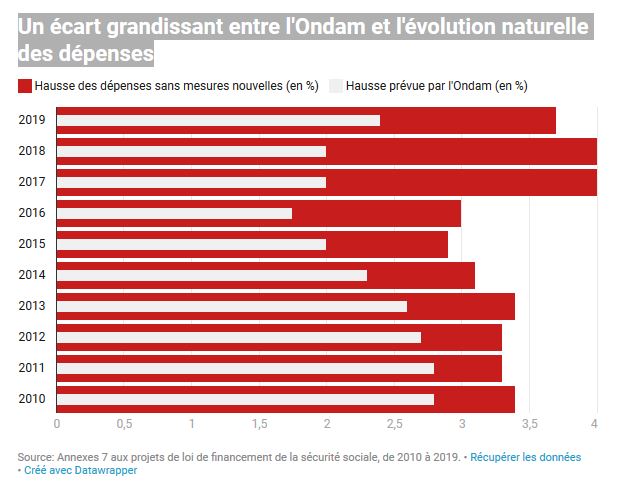 L’Ondam augmente chaque année, d’une LFSS à l’autre. Mais moins que l’évolution "naturelle" des dépenses des hôpitaux, qui s’accroissent pour suivre les besoins de santé de la population. « Cette progression est liée à la hausse de la population et de la part des personnes de plus de 65 ans, ainsi qu’à l’explosion des maladies chroniques depuis 30 ans », détaille Rachel Bocher. La hausse des charges des hôpitaux qui se produirait en l’absence de mesures nouvelles d’économies est calculée dans chaque LFSS, et tourne autour de 3,5% par an. « Et c’est une estimation basse », pointe Rachel Bocher. Or, la hausse de l’Ondam fixée chaque année est bien inférieure, à 2,3% en moyenne sur la dernière décennie.