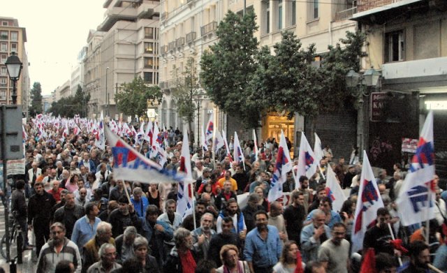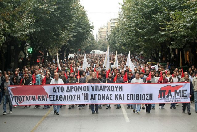 Une importante délégation du Comité central du KKE a pris part à la manifestation, dirigée par Aleka Papariga, la SG du CC du KKE, qui a déclaré lors de la manifestation du PAME dans Omonia : « Nous demandons aux gens de montrer désobéissance et défiance systématiques et bien organisées, non seulement envers les mesures du gouvernement, mais envers le système en général. C’est un bon point de départ pour que la contre-attaque puisse être organisée, qui doit avoir pour objectif la suppression des monopoles, la libération des engagements de l’Union européenne, c’est-à-dire le désengagement de l’UE. Toute autre solution proposée s’inscrit dans le cadre du système ».