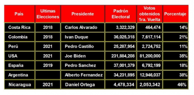 Au moment ou les USA, l’Union Européenne, donc la France, et tous les états à la botte de l’impérialiste US, se déchainent contre le FSLN, contre Daniel Ortega, clamant qu’ils ne reconnaîtraient pas les résultats des élections Nicaraguayennes, alors que « le grand démocrate Joé Balden » menace de nouvelles sanctions contre le Nicaragua, il est bon de rappeler les scores électoraux des Présidents ou chefs de gouvernement de quelques Pays :