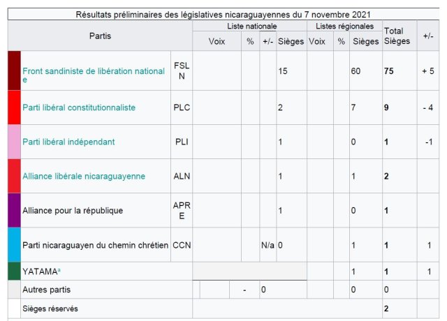 Je n’ai pas eu le décompte définitif, mais je peux indiquer que le FSLN remporte 15 sièges sur les 20 à pourvoir.