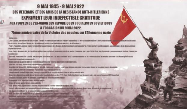 DES VETERANS ET DES AMIS DE LA RESISTANCE ANTI-HITLERIENNE EXPRIMENT LEUR INDEFECTIBLE GRATITUDE AUX PEUPLES DE L’EX-UNION DES REPUBLIQUES SOCIALISTES SOVIETIQUES A L’OCCASION DU 9 MAI 2022, 77e anniversaire de la Victoire des peuples sur l’Allemagne nazie
