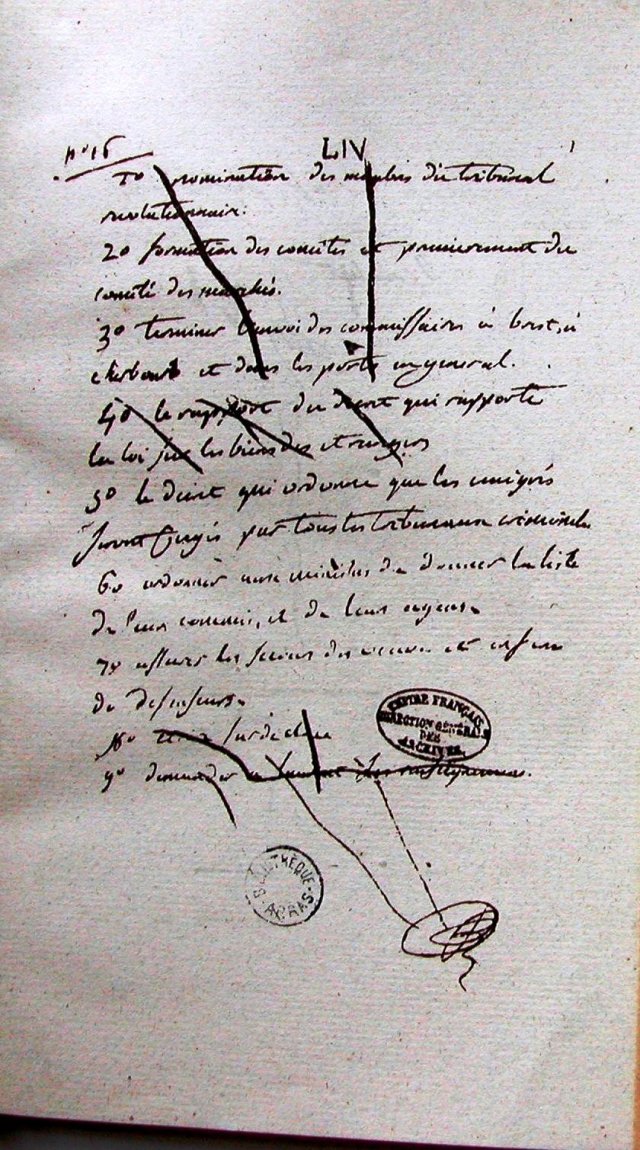 Une série de lettres détaille son action politique et permet de le situer dans un contexte familial précis et des plus intéressants à étudier pour comprendre le culte et la mémoire des héros républicains après leur disparition. Le second lot, beaucoup plus important et donc bien plus cher (200 000 à 300 000 euros), contient des documents encore plus précieux, puisque rédigés de la main même de celui qui fut appelé “l’Incorruptible”. Ce sont des discours, des projets d’articles de journaux, des brouillons de rapports devant être lus à la Convention, et le fragment d’un discours écrit à la veille de son arrestation, l’avant-veille de sa mort, discours contre la conspiration en train de se préparer contre lui et ses proches. Une lettre sur la vertu et le bonheur termine cette série de documents exceptionnels qui manquent aux collections de manuscrits aussi bien des Archives nationales que de la Bibliothèque nationale de France (BNF). Ce serait une grande perte si ces deux lots devaient terminer dans des fonds privés à l’étranger ou, plus humiliant, s’ils venaient à être acquis par une bibliothèque hors de France.