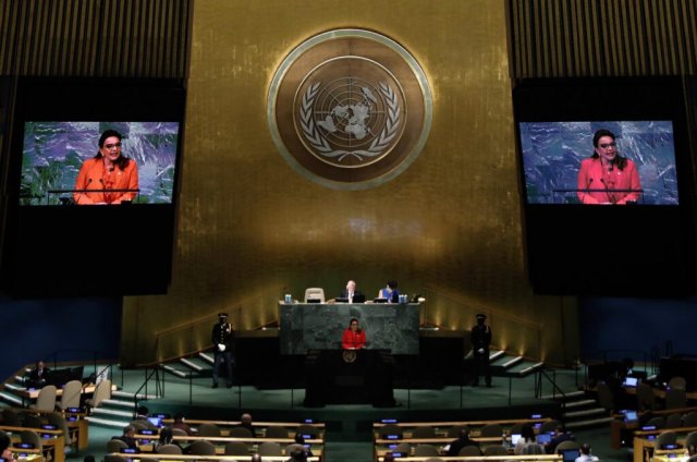 Je me tiens devant cette tribune mondiale, dans ce qui représente pour mon pays un fait historique, non seulement parce que je suis la première femme à avoir l’honneur de diriger notre nation d’Amérique centrale, mais aussi parce que je représente le premier gouvernement démocratiquement élu, Après 13 ans de dictature : Le coup d’État de 2009 chargé de meurtres cruels et d’escadrons de la mort, deux fraudes électorales, une pandémie et deux ouragans.