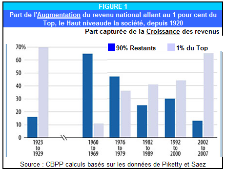 Non seulement les plus riches de ces 1 % des Américains s’octroient une part considérable du revenu national, mais leur part est plus importante qu’à tout autre moment depuis la Grande Dépression, comme le Centre pour les priorités budgétaires et politiques l’illustre dans ce tableau en utilisant les données de 2007 :