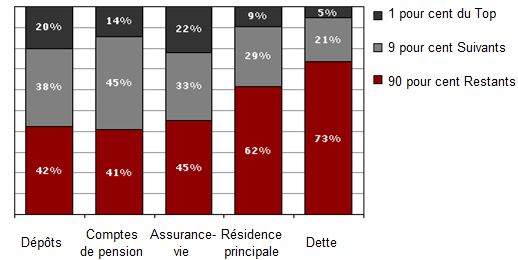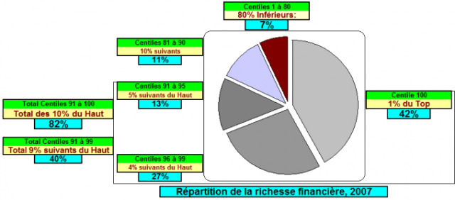 – 42 % de la richesse financière du pays (valeur nette totale diminuée de la valeur de la maison) appartient aux 1%.