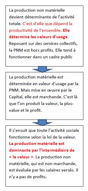 En résumé, puisque la sphère de la production matérielle est marchande (« marchande capitaliste »), c’est elle qui fournit la valeur pour tout l’ensemble. Elle finance le capital public et les salaires publics. Les salariés de la PM demeurent au cœur de l’exploitation, comme avant, à l’époque du capitalisme industriel simple, bien que leur activité soit maintenant déterminée par la sphère de la PNM (qui fonctionne selon la loi de la valeur bien que ne produisant pas de marchandises).