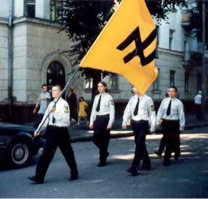 « Dans les années précédents l’indépendance de l’Ukraine en 1991, Paroubiy était un activiste indépendantiste ; il fut arrêté pour la tenue d’un rassemblement illégal en 1988. En 1991, il fonde le Parti Social-Nationaliste d’Ukraine avec Oleh Tyahnybok ; ce parti combinant le nationalisme radical et plusieurs traits néo-nazi ».