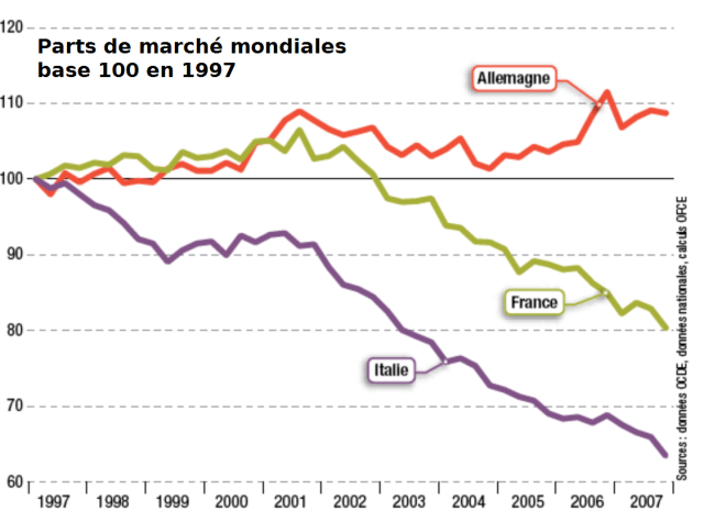 | Le constat le plus intéressant est que sur la première partie de la décennie 2000, la France a concilié de bonnes performances en termes d’évolution de son coût salarial unitaire avec pourtant des baisses de part de marché [10] : Évolution du coût salarial unitaire (base 100 en 1997) :