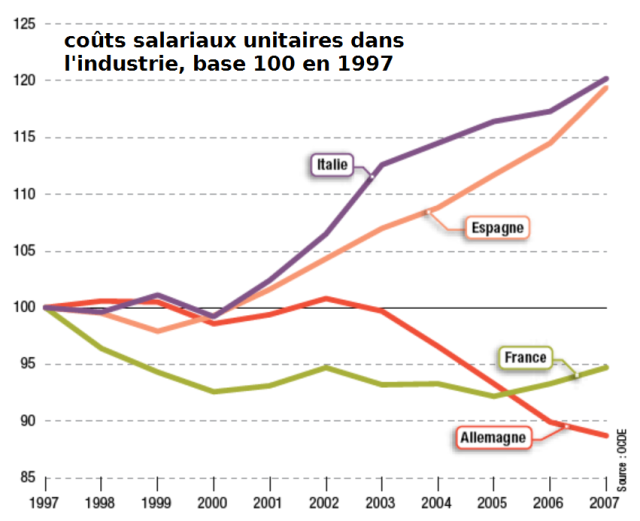 Concernant le coût salarial unitaire dans l’ensemble de l’économie, l’institut Carnegie [9] analyse que la France a décroché de l’Allemagne pendant les années 2000. Le coût salarial par unité produite base 100 début 2002 serait de 105 pour l’Allemagne début 2011 alors qu’il serait de 120 pour la France.