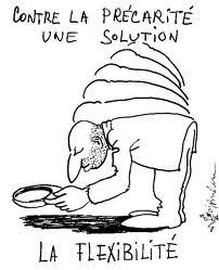 | Vers des « lois Hartz » à la française ? Il y a beaucoup à craindre des négociations engagées en France, appelées « sécurisation de l’emploi » suite à l’appel du Ministre du Travail, Michel Sapin, adressé aux partenaires sociaux pour qu’ils débouchent en négociant sur un « compromis historique », réformant en profondeur le marché du travail : doivent y être discutées les possibilités de pouvoir licencier plus facilement tout en assurant plus de "sécurité" aux salariés, ou l’accroissement de la flexibilité interne à l’entreprise avec un recours plus aisé au chômage partiel ou encore la possibilité d’abaisser le temps de travail et les salaires quand l’activité est faible. Le patronat a tiré le premier avec « un projet choc » comme le titrait le journal Les Echos [6] : assouplissement du CDI, réduction des possibilités de recours contre les licenciements, etc. (NDLR : Cet article prémonitoire a été écrit avant la signature de l’accord de soumission totale au patronat par les syndicats jaunes menés par la CFDT.) |