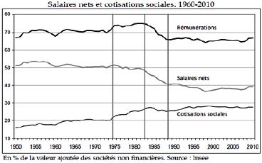 « Ce constat permet de comprendre pourquoi les "charges" sont devenues un enjeu central du débat économique. Du côté des salaire nets, en effet, la baisse ne peut aller beaucoup plus loin que le recul acquis au cours des années 1980, durant lesquelles ils sont passés de 50% à moins de 40% de la valeur ajoutée de entreprises. D’où les recommandations visant, soit à baisser le niveau de la protection sociale, soit à en reporter la charge sur les finances publiques. Les allégements de cotisations ou la TV A sociale correspondent à ce schéma. De même, les réformes successives des retraites ont toutes été menées en postulant que la part du revenu national allant aux retraités ne devrait plus jamais augmenter, quel que soit leur nombre. »