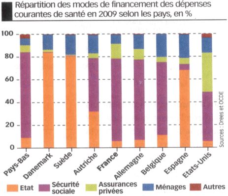 Le graphique ci-dessus [8], montre les différents modèles de financement des dépenses courantes de santé en 2009 dans différents pays dont la France et les États-Unis.