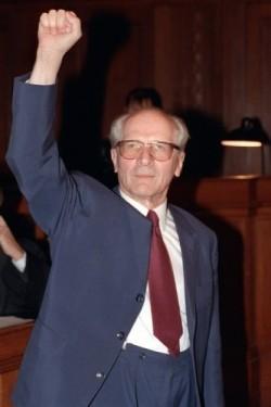 Erich Honecker est né en 1912, dans une famille de mineurs. Il grandit avec un groupe d’enfants et dans la jeunesse communiste, à 17 ans il devient membre du KPD (Parti Communiste d’Allemagne). Dans les années 1930-31, il étudie à l’Ecole Lénine à Moscou. Il fut un résistant antifasciste. Entre 1935 et 1945 il est prisonnier des nazis. Après la guerre, il est cofondateur de la Jeunesse Libre Allemande (FDJ) et devient son président jusqu’en 1955. Il entre à la Grande école du Parti à Moscou. Il exerce diverses hautes responsabilités dans l’appareil du parti et de l’Etat de la RDA. A partir de 1976, il devient secrétaire général du SED, président du Conseil d’Etat et du Conseil national de la défense jusqu’au 18 octobre 1989. Il est ensuite extradé de Moscou en RFA en 1992. Il fût relâché, après 169 jours de prison, le 13 février 1993 pour raison de santé. Suite à l’audience principale annoncée pour le 8 février 1993 à Berlin, il décède à Santiago du Chili le 29 mai 1993.