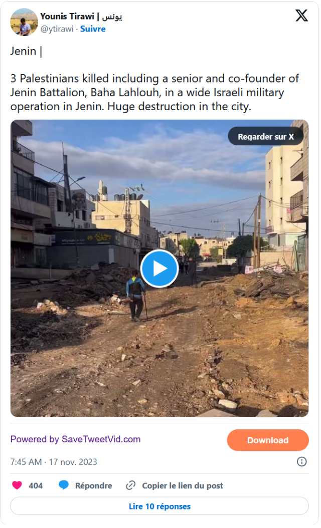 Dans la nuit du jeudi 16 novembre, l’armée israélienne a mené son quatrième raid contre le camp de Jénine depuis le début de la guerre. Les soldats israéliens ont pénétré dans le camp avec des véhicules militaires et des bulldozers, censés les protéger des engins explosifs. Le camp a également subi plusieurs bombardements.