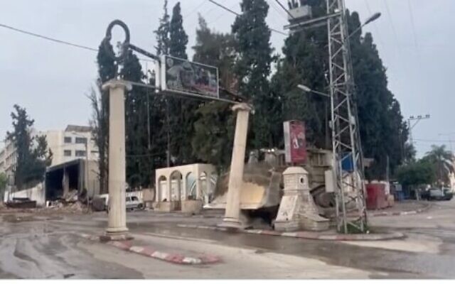 Un bulldozer de l’armée israélienne détruisant un monument en mémoire du défunt président de l’OLP, Yasser Arafat, à l’entrée du camp de réfugiés de Tulkarem en Cisjordanie, le 14 novembre 2023. (Crédit : Capture d’écran/X)