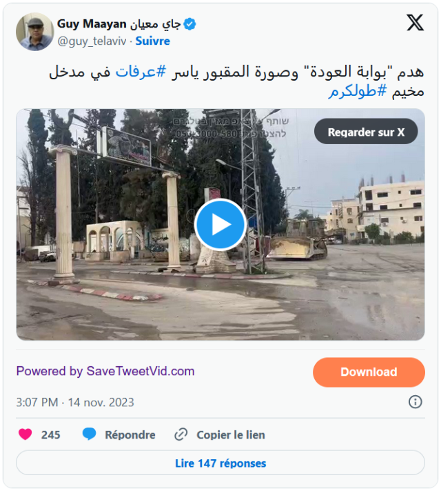 vidéo montrant un bulldozer de l’armée israélienne détruire un monument “la porte du retour”, à Tulkarem, le 14 novembre.