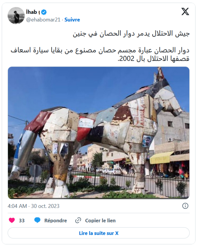 A Jénine, la statue du cheval, l’un des symboles les plus importants du nationalisme palestinien, a également été détruit par l’armée israélienne le 30 octobre. Cette statue a été construite en 2003 à partir de pièces de voitures détruites par l’armée d’occupation. Sa tête est orientée vers la ville Haïfa, car les réfugiés du camp sont originaires de cette région. Ils avaient fui en 1948, lors de la Nakba [terme signifiant “catastrophe” en arabe, se référant à l’exode de 1948, NDLR].