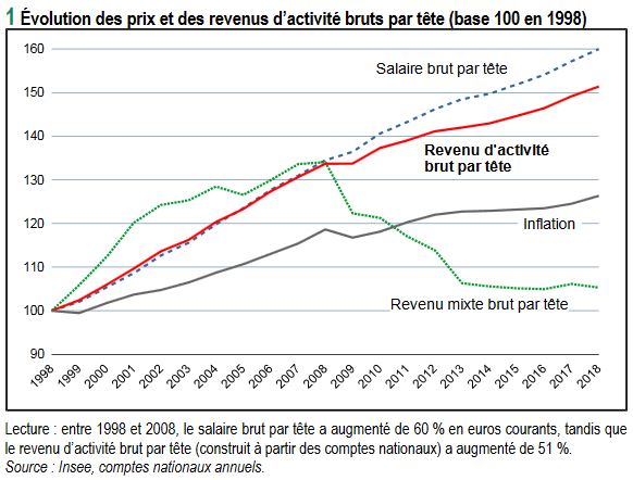 La conséquence est que, à compter de 2008, l’indicateur du revenu moyen d’activité par tête calculé selon les hypothèses précédentes progresse nettement moins vite que le salaire moyen par tête. Entre 2008 et 2018, le salaire moyen par tête a augmenté en moyenne de 1,1% par an (hors inflation), alors que le revenu moyen d’activité par tête n’a augmenté que de 0,6% par an en moyenne (hors inflation).