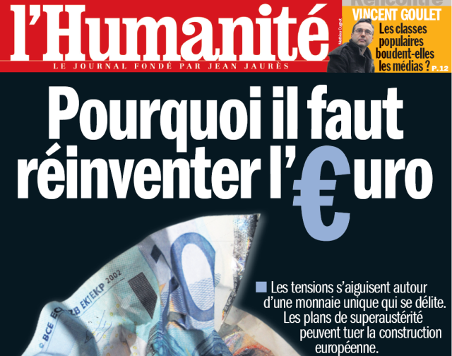 Le titre de l’Huma était accrocheur : « Il faut réinventer l’Euro ». On sent que le comité de rédaction a longuement discuté pour être à la hauteur des titres de Libération et des enjeux de l’époque. Vous vous rendez compte ? Et si la crise de l’Euro « tuait la construction européenne » comme le dit le sous-titre ? Pour les dirigeants du PCF et de l’Humanité, ce serait alors la fin de tout espoir de changement social et progressiste, la fin de la construction européenne !
