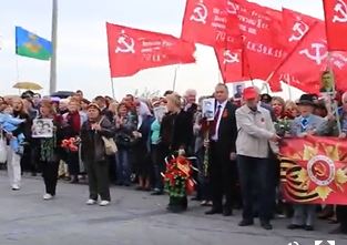 Kherson, au bord de la mer noire. Au micro, le gouverneur Odarchenko (du parti de Yulia Tymoshenko), imposé par la junte après le coup d’État. Quand il compare Poutine à Hitler, les manifestants commencent à le huer et une dame avec un bébé dans ses bras va lui enlever le micro… Pour nos médias, c’est une terroriste...