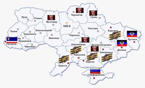 A cette carte qui couvre seulement l’Ukraine, il faudrait ajouter des liens avec la Moldavie dont les élections vont avoir lieu en novembre, la Transnitrie dont nous avons souvent parlé ici et qui réclame son rattachement à la Russie, ainsi que des petites républiques du Sud de la Moldavie qui en font autant... Mais on ne peut pas ignorer les liens avec l’ex-Yougoslavie dans laquelle les mouvements sociaux se multiplient, pas plus qu’avec la Bulgarie et surtout le chaudron des sorcières qu’est la Caucase...