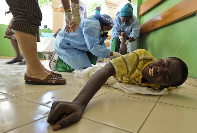 Des médecins cubains soignent un homme blessé par balle à l’hôpital New Renaissance de Port-au-Prince, à Haïti, le 18 janvier 2010, une semaine après un tremblement de terre dévastateur.
