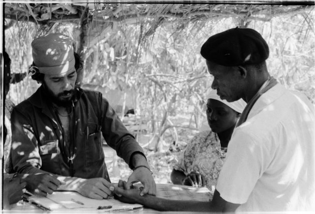 Consultation par un médecin cubain. Sara, Guinea-Bissau, 1974.
