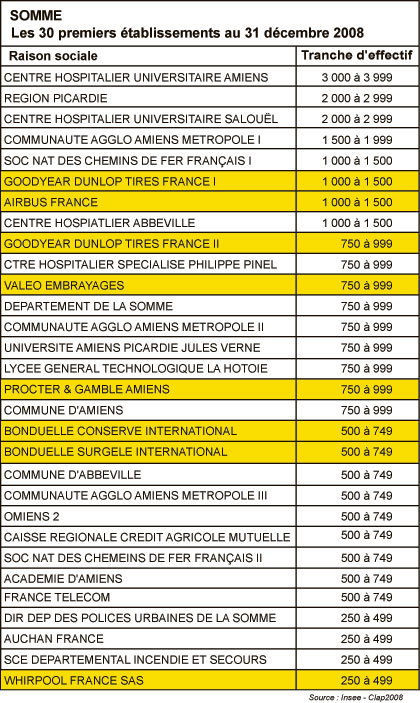 Dans la « première région ouvrière de France » (d’après Le Figaro), les élus picards sont bien placés pour la connaître, « la réalité du mouvement ». Qu’on se penche sur deux tableaux commandés à l’INSEE (voir plus bas) : les 30 plus grands établissements au 31 décembre 1996 pour le département de la Somme, et le même classement au 31 décembre 2008. C’est une enquête toute bête, et pourtant éclairante sur le chemin parcouru, en une décennie, ici et partout en France. Dans cette liste, au milieu des administrations et des services publics (le « centre hospitalier régional » n°1, la « commune d’Amiens » n°2, le « département de la Somme » n°4, la « Société national des chemins de fer français » n°5, etc.), on dénombrait encore quinze usines au milieu des années 90. Il en reste sept, désormais. En douze ans, la moitié a disparu de la liste. Une véritable hécatombe industrielle. Et ceci, avant la crise. Et en plein dans cette débâcle, nos responsables se félicitent de « relocalisations » ! Comme si en juin 40, l’état-major publiait des communiqués triomphalistes – tandis que les troupes reculaient jusque Bordeaux… Il y a pire que de l’aveuglement, là-dedans. Du mépris. Entre ces deux tableaux, en filigrane derrière ces colonnes bien ordonnées, pour des milliers de familles la vie est devenue une angoisse, il y en a des milliers, comme Gilette, ouvrière évacuée de chez Parisot, son mari de chez Peaudouce : « Une fois, on est allés en vacances. Une fois, cinq jours à Quend Plage. Sinon, on a travaillé toute notre vie. Et on se retrouve avec quoi ? Rien. On n’a même plus une cuillère à café, à nous. On a remboursé notre dette, mais on ne vit plus chez nous, on habite chez notre fille, notre beau-fils. C’est pas facile. On se demande pourquoi on vit. À Noël dernier, d’ailleurs… (Silence) On a failli… (Silence) Enfin, je lui ai parlé de nous tuer, à mon mari ». Mais de tout cela, pas un mot. Comme si eux ne comptaient pour rien.