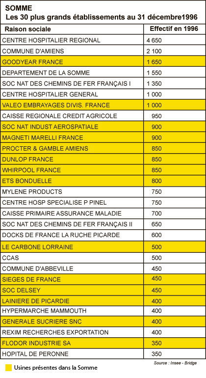 Ces deux tableaux de l’INSEE racontent, en raccourci, une histoire de notre pays, une histoire populaire, une histoire ordinaire, une histoire avec un scénario immuable. Qu’on les passe donc en revue, ces « 30 plus grands établissements de la Somme ». Froidement. Et cliniquement.
