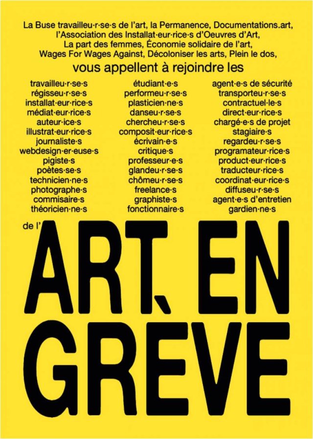 Enfin, de multiples travailleuses et travailleurs de l’art n’appartenant pas directement à une structure les employant se mobilisent depuis les préparatifs du 5 décembre. Beaucoup ont répondu à l’appel « Art en grève » initié par plusieurs collectifs abordant de nombreuses questions politiques et sociales quant aux conditions de production de l’art, comme La Buse travailleurses de l’art, Documentations.art, La Part des Femmes, Économie solidaire de l’Art, rapidement rejoints par des organisations syndicales et politiques comme le Syndicat National des Artistes Plasticiens – CGT ou l’équipe culture de la France Insoumise. Largement relayé et signé, cet appel entend clairement que la retraite par capitalisation est également une quasi impossibilité pour de nombreuses profession de l’art d’exercer leur métier. En effet, lorsque Édouard Philippe annonce une retraite minimum de 1.000€ pour toutes les carrières complètes, comment appliquer cela à des professions ponctuées de trous dans les périodes de travail rémunérées inhérents à ces types de travail ? Plus que sur la seule question des retraites, c’est également un mouvement voulant se battre contre l’importante précarité d’une multitude de professions aux statuts instables et souvent de fortune faute de mieux qu’illustre la longue énumération de métiers en tête d’appel.