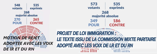 Et au même moment pourtant, le patronat ne cesse d’expliquer à quel point la France aurait besoin d’immigration, son ancienne patronne avait dit « l’immigration est une chance pour la France ». Il y a des études économiques et démographiques très sérieuses et répétées qui démontrent qu’il y a besoin d’immigration pour les décennies à venir. Il y a aussi des reportages incessants sur les difficultés des restaurateurs, artisans, paysans, petits entrepreneurs, qui sont contraints de faire travailler des sans-papiers... Contradiction ? Les votants de cette loi, le club des R, RN, LR, Renaissance seraient-ils contre les patrons ?