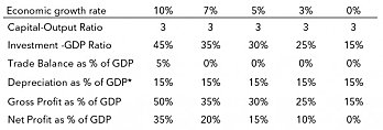 Désormais, supposons que la Chine doive rééquilibrer son économie vers une économie tirée par la consommation. Le tableau 1 présente divers scénarios de possibles « ré-équilibrages » du capitalisme Chinois. Chaque scénario correspond à un ensemble de conditions bien particulières nécessaires pour stabiliser l’économie capitaliste (avec un taux de profit stable plutôt que déclinant). Par exemple, si le taux de croissance de la Chine devait chuter à 7% par an, alors pour stabiliser le rapport capital-production, les investissements devraient chuter à 36% du PIB (arrondi à 35% dans le tableau 1). Si on tient compte du fait que les principaux marchés d’exportation de la Chine (les États-Unis et l’Union européenne) stagneront très probablement à l’avenir tandis que les importations d’énergie et de matières premières de la Chine continueront à croître, la balance commerciale Chinoise devrait revenir à l’équilibre. Il s’ensuit que la somme de la consommation des ménages (salaires) et des dépenses publiques doit atteindre les 65% du PIB. Le bénéfice brut doit tomber à 35% du PIB, et le bénéfice net à 20% du PIB.