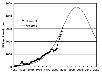 La Chine dépend du charbon pour près de 75% de sa consommation d’énergie. De 1979 à 2009, la consommation de charbon de la Chine a crû à un taux annuel moyen de 5,3%, et l’économie Chinoise a crû à un taux annuel moyen de 10% (mais pour la dernière décennie, 1999 à 2009, la consommation de charbon Chinoise s’est accélérée pour atteindre 8,9% par an). Si on extrapole de façon généreuse, le taux de croissance futur de la Chine devrait être celui de la production de charbon, plus 5%. Selon les sources gouvernementales Chinoises, la Chine a des réserves de charbon de près de 190 milliards de tonnes. Le graphique 1 compare la production historique de charbon avec sa production future envisagée, en supposant que le charbon récupérable restant corresponde aux réserves officielles.