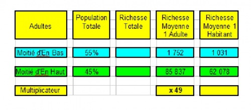 La « moitié légère » -critère du nombre d’individus- (dans laquelle nous sommes comme pays occidental développé), représentant 45% de l’humanité vit avec 98% des richesses mondiales. La richesse moyenne par adulte y est de 85 837 $ [49 fois celle de son alter ego d’en face], celle par habitant de 62 078 $ [60 fois celle du même].