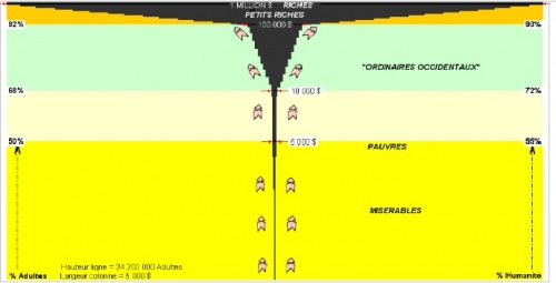 C’est ainsi que la seule et unique première ligne du haut de la figure totalise en noir les 24 200 000 adultes millionnaires [riches] (*). Deux petites flèches rouges indiquent cette ligne représentant 0,5% de l’humanité. Il est impossible de parvenir à construire un graphique reflétant à la fois la situation du billionnaire et celle du crève la faim, la largeur de la feuille n’excédant pas le million de $. Nous resterons donc très loin du billion ! Il reste donc à imaginer ce qui manque.