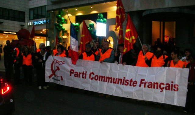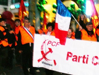 Pour marquer l’évènement, on échange un drapeau PCF contre un PCP, bien sûr, les deux ont faucille et marteau.