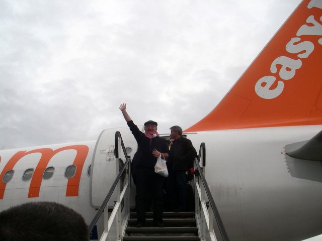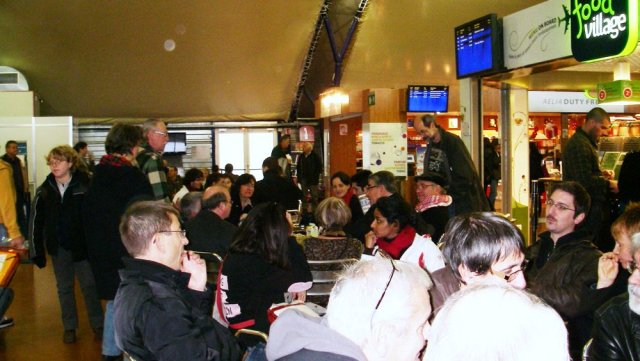 Sauf qu’à 9h00 dans le terminal 3 dédié aux « low cost » de St-Exupéry, une dizaine de camarades a passé le sas, et subitement le reste est bloqué... on nous demande de quitter le terminal pour retourner dans l’aéroport... Discussions pour nous expliquer qu’un oiseau a endommagé le réacteur de l’avion qui aura du retard, certains parlent de 1h50, d’autres de 3h... On négocie pour rester en groupe et finalement, une employée sympathique de EasyJet accepte de laisser le groupe passer...