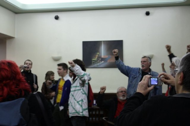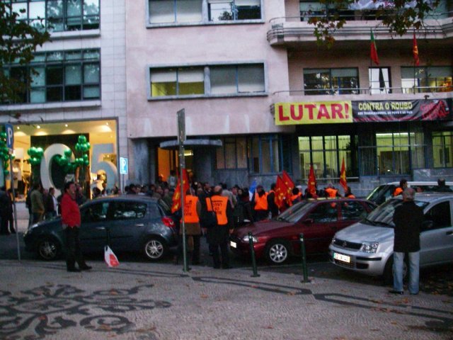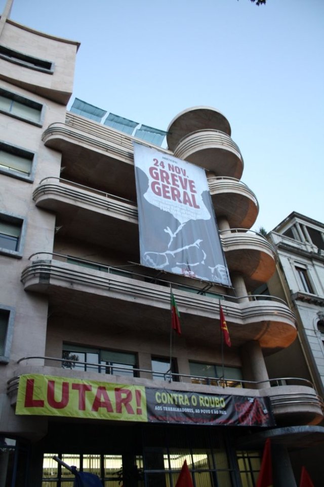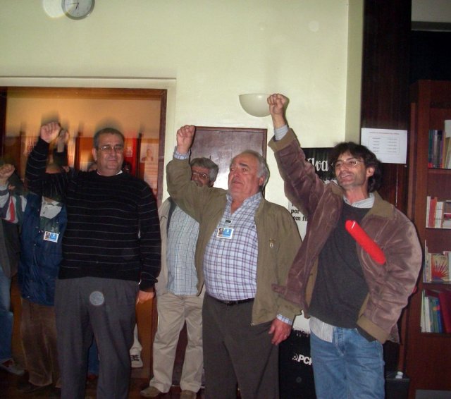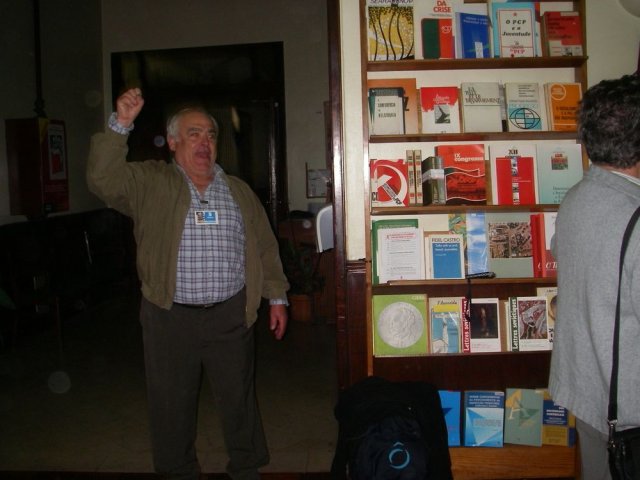 Mais on voit un bâtiment avec du monde devant, qui visiblement a manifesté. Des banderoles, des drapeaux rouges... C’est un bâtiment du PCP ! Celui de la fédération du nord du Tage, le fleuve qui partage Lisbonne en deux. La discussion s’engage, le hasard a bien fait les choses. Nous allons pouvoir rencontrer le PCP !