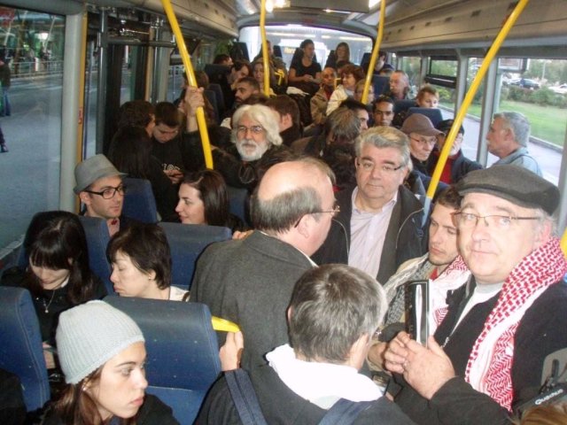Théo reste calme. Marie-Christine et deux JC décident de rester à l’aéroport et le reste du groupe cherche la navette... On la remplit très vite, elle devrait partir, mais rien ne se passe... Après plus de 5 minutes, le chauffeur descend, remonte, une personne visiblement habilitée monte et descend (nous n’avons pas de doute... RG ou équivalent !), puis des policiers arrivent. On commence à se dire qu’on ne verra peut-être pas la place du marquis de Pombal... Un policier demande à Édith de sortir. On montre sans s’énerver qu’elle n’est pas toute seule. Le député André Gerin s’avance...
