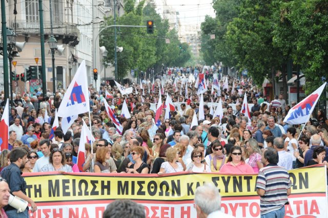 « La vérité est claire et limpide. Quiconque marque son désaccord avec les mémoranda, les directives de transposition, les accords de prêt, la troïka... est contre l’UE, ses accords et ses décisions, est contre la voie de développement capitaliste qui est présentée comme la voie à sens unique. Quiconque applaudit à la fois l’UE et les manifestations contre l’UE ne fait que tromper le peuple.