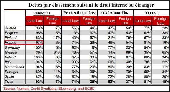 Venons-en maintenant aux conséquences financières. Ces conséquences se concentrent sur la question des dettes, qui peuvent avoir été faites dans le droit français, auquel cas la transformation des sommes de l’Euro en Franc est de droit et automatique, et celles qui ont été faites dans un autre droit que le droit français. Il faut donc calculer non pas la proportion des acheteurs de dette français et étrangers, mais la proportion des contrats passés en droit français ou en droit étranger.