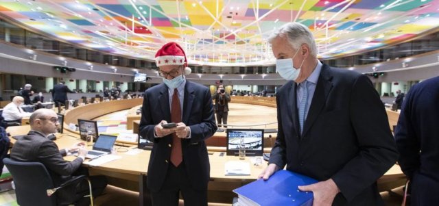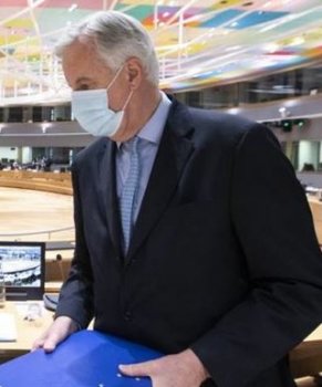 Parmi ses nombreuses fonctions, l’homme a notamment été ministre français aux affaires européennes (1995-1997), commissaire européen à la politique régionale (1999-2004), ministre des affaires étrangères (chapeautant les affaires européennes, 2004-2005), à nouveau commissaire européen (et vice-président de la Commission) chargé du marché intérieur (2010-2014). Enfin, il a derechef servi Bruxelles en dirigeant, à partir de 2016, les pourparlers de la Commission européenne avec Londres (une expérience qu’il a relatée dans un livre – que personne n’a lu – où il exprime tout le mal qu’il pense du Brexit / photo : M. Barnier, à droite, présente au Conseil européen fin décembre 2020 l’accord finalement signé avec le Royaume-Uni).