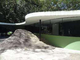 Mon souci est que l’architecture s’adapte aux conditions du terrain, qu’elle ne modifie pas la pente du terrain. Dans cette perspective, ma maison à Canoas est un exemple ; le terrain était comme ça. J’ai placé les chambres et le salon en bas et je n’ai pas touché au terrain. La toiture est venue ensuite, avec cette forme. Il y a un mur ici, la dalle vient comme ceci, et il y a là un rocher que j’ai laissé en place. La piscine a une forme libre dans le paysage.