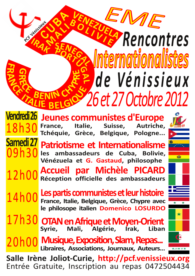 Patriotisme, Internationalisme, Partis Communistes, Europe, Résistances et Guerres impérialistes... 26 et 27 Octobre 2012 : le programme et les contacts...