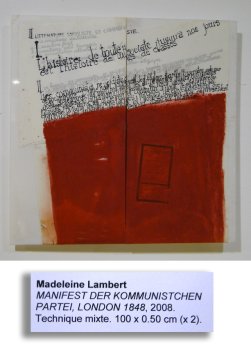 la magnifique exposition de l’artiste peintre Madeleine Lambert. Ses œuvres mêlant écriture et graphismes mettent en forme des mots qui disent l’histoire, les guerres, les actes politiques, donnant à voir autrement les longues listes des villes victimes de la guerre, la longue liste des guerres états-uniennes, ou encore le manifeste dont le texte s’écrase au dessus d’un grand pavé rouge. Comme l’an dernier, cette exposition de peintures transforment la salle et donc les rencontres en un lieu subitement devenu humain, habité par un regard qui attire et interpelle