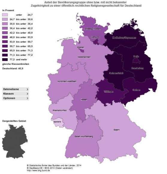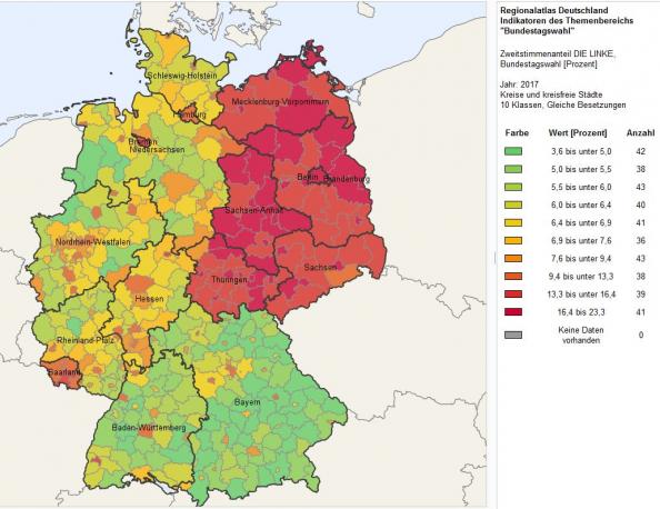 Enseignement du bilan, c’est que 30 ans après la chute du mur, l’Allemagne de l’Est reste la partie la plus à gauche de l’Allemagne, ainsi que celle où la religion est la plus absente. En témoigne la carte du vote Die Linke en 2017, ainsi que la carte de la proportion de la population athée, que nous publions ci dessous.