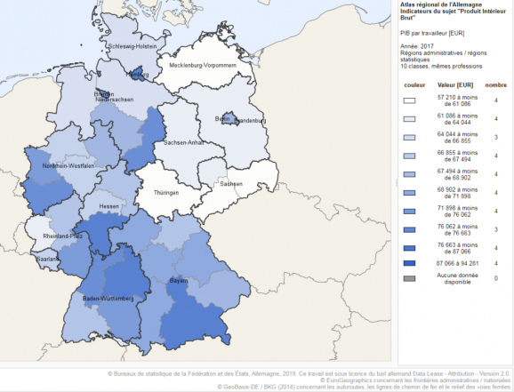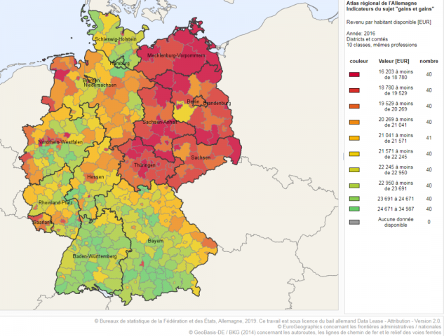 Le revenu par habitant en Allemagne de l’Ouest est généralement supérieur à 22.000 € par an, contre généralement moins de 19.000 € à l’Est. 16% d’écart après 30 ans !